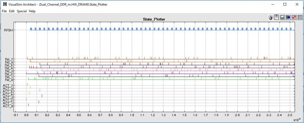 To evaluate the benefits of the dual channel memory for our system design, we assembled a system-level modeling using commercial software- VisualSim Architect from Mirabilis Design Inc. The flow of the model in VisualSim contains two Masters with equal access to both the DDR-DRAM. The first Master generates transaction and is connected to the Master Port of the AXI. This Master reads data from the first slave AXI bus port using the DDR3 controller. Similarly the second Master writes the data through bus interface to the second memory controller (DDR3). The width of the AXI bus is 4 bytes and the clock frequency is 500MHz. Both memory controllers are running at the same clock frequency and width. The first master targets the same row on all the Banks while the second Master performs random accesses. In the model, we generate an address that fits the address bit map and is used by the memory controller to breakdown into row, column and bank. This address is used to select the row-column in the DRAM. The memory controller has a request buffer that searches for the next sequential request. This way, the performance of the memory is optimized for minimal activate signals.