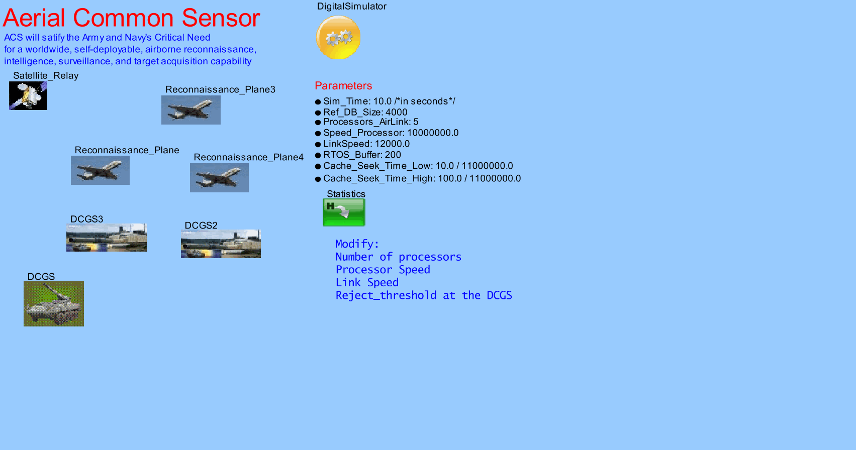 To illustrate the application of VisualSim, a simulation model based on the US Department of Defense Aerial Common Sensor (ACS) specification has been utilized. Working from unclassified public information available from the site hosted by Fort Monmouth, we have created the first cut model we describe below. The estimates and assumptions we made to create this model target a few specific areas of interest such as throughput latency, and RTOS buffering. The model can be adjusted and refined in many ways to improve precision or target other criteria as desired. Our intent here is to highlight the benefits of using VisualSim in a major program like ACS where effective modeling and the ability to share detailed and precise documentation across a multi-organization supplier team is critical to delivering the most capable system on time and within budget. See the notes at the bottom of this page for more details of the ACS program requirements and in particular, the Modeling and Simulation requirements for which VisualSim is ideally suited.