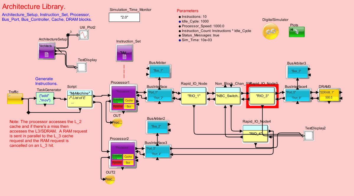 <h2>TextDisplay2</h2><table border="1"><tr><td><b>Parameter</b></td><td><b>Expression</b></td><td><b>Value</b></td></tr><tr><td>Block_Documentation</td><td>Enter User Documentation Here</td><td>Enter User Documentation Here</td></tr><tr><td>rowsDisplayed</td><td>10</td><td>10</td></tr><tr><td>columnsDisplayed</td><td>40</td><td>40</td></tr><tr><td>suppressBlankLines</td><td>false</td><td>false</td></tr><tr><td>title</td><td>&quot;Rapid IO Messages&quot;</td><td>&quot;Rapid IO Messages&quot;</td></tr><tr><td>ViewText</td><td>true</td><td>true</td></tr><tr><td>saveText</td><td>false</td><td>false</td></tr><tr><td>fileName</td><td>Enter Filename to save text</td><td>&quot;Enter Filename to save text&quot;</td></tr><tr><td>Append_Time</td><td>true</td><td>true</td></tr></table> <h2>TextDisplay</h2><table border="1"><tr><td><b>Parameter</b></td><td><b>Expression</b></td><td><b>Value</b></td></tr><tr><td>Block_Documentation</td><td>Enter User Documentation Here</td><td>Enter User Documentation Here</td></tr><tr><td>rowsDisplayed</td><td>10</td><td>10</td></tr><tr><td>columnsDisplayed</td><td>40</td><td>40</td></tr><tr><td>suppressBlankLines</td><td>false</td><td>false</td></tr><tr><td>title</td><td>&quot;Detailed Processor Activity&quot;</td><td>&quot;Detailed Processor Activity&quot;</td></tr><tr><td>ViewText</td><td>true</td><td>true</td></tr><tr><td>saveText</td><td>false</td><td>false</td></tr><tr><td>fileName</td><td>Enter Filename to save text</td><td>&quot;Enter Filename to save text&quot;</td></tr><tr><td>Append_Time</td><td>true</td><td>true</td></tr></table> <h2>Traffic</h2><table border="1"><tr><td><b>Parameter</b></td><td><b>Expression</b></td><td><b>Value</b></td></tr><tr><td>Block_Documentation</td><td>Enter User Documentation Here</td><td>Enter User Documentation Here</td></tr><tr><td>Data_Structure_Name</td><td>&quot;Processor_DS&quot;</td><td>&quot;Processor_DS&quot;</td></tr><tr><td>Start_Time</td><td>0.0</td><td>0.0</td></tr><tr><td>Value_1</td><td>1.0</td><td>1.0</td></tr><tr><td>Value_2</td><td>2.0</td><td>2.0</td></tr><tr><td>Random_Seed</td><td>123457L</td><td>123457L</td></tr><tr><td>Time_Distribution</td><td>Single Event</td><td>Single Event</td></tr></table> <h2>Util_Plot2</h2><table border="1"><tr><td><b>Parameter</b></td><td><b>Expression</b></td><td><b>Value</b></td></tr><tr><td>Block_Documentation</td><td>Enter User Documentation Here</td><td>Enter User Documentation Here</td></tr><tr><td>fillOnWrapup</td><td>true</td><td>true</td></tr><tr><td>legend</td><td>Processor Stall Time</td><td>Processor Stall Time</td></tr><tr><td>startingDataset</td><td>0</td><td>0</td></tr><tr><td>_explanation</td><td>Result-&gt;Plotter-&gt;SequencePlotter</td><td>Result-&gt;Plotter-&gt;SequencePlotter</td></tr><tr><td>xInit</td><td>0.0</td><td>0.0</td></tr><tr><td>xUnit</td><td>2.0</td><td>2.0</td></tr></table> <h2>ArchitectureSetup</h2><table border="1"><tr><td><b>Parameter</b></td><td><b>Expression</b></td><td><b>Value</b></td></tr><tr><td>Block_Documentation</td><td>Enter User Documentation Here</td><td>Enter User Documentation Here</td></tr><tr><td>Architecture_Name</td><td>&quot;Architecture_1&quot;</td><td>&quot;Architecture_1&quot;</td></tr><tr><td>Field_Name_Mapping</td><td>/* First row contains Column Names.                */\\nExternal_Field_Name          Internal_Field_Name   ; \\nA_Address                    A_Address             ; \\nA_Bytes                      A_Bytes               ; \\nA_Data                       A_Data                ; \\nA_IDX                        A_IDX                 ; \\nA_Instruction                A_Instruction         ; \\nA_Priority                   A_Priority            ; \\nA_Source                     A_Source              ; \\nA_Destination                A_Destination         ; \\nA_Task_ID                    A_Task_ID             ; \\nA_Time                       A_Time                ; \\n</td><td>/* First row contains Column Names.                */\\nExternal_Field_Name          Internal_Field_Name   ; \\nA_Address                    A_Address             ; \\nA_Bytes                      A_Bytes               ; \\nA_Data                       A_Data                ; \\nA_IDX                        A_IDX                 ; \\nA_Instruction                A_Instruction         ; \\nA_Priority                   A_Priority            ; \\nA_Source                     A_Source              ; \\nA_Destination                A_Destination         ; \\nA_Task_ID                    A_Task_ID             ; \\nA_Time                       A_Time                ; \\n</td></tr><tr><td>Routing_Table</td><td>/* First row contains Column Names.                */\\n/*Source_Node    Destination_Node   Hop           Source_Port ; \\nProcessor_1    Processor_2        Processor_2   bus_out     ; \\nProcessor_2    Processor_1        Processor_1   instr_out   ; \\nSDRAM_1        Processor_2        Processor_2   output      ;\\nSDRAM_2        Processor_3        Processor_3   output      ;*/</td><td>/* First row contains Column Names.                */\\n/*Source_Node    Destination_Node   Hop           Source_Port ; \\nProcessor_1    Processor_2        Processor_2   bus_out     ; \\nProcessor_2    Processor_1        Processor_1   instr_out   ; \\nSDRAM_1        Processor_2        Processor_2   output      ;\\nSDRAM_2        Processor_3        Processor_3   output      ;*/</td></tr><tr><td>Number_of_Samples</td><td>20</td><td>20</td></tr><tr><td>Statistics_to_Plot</td><td>&quot;Processor_1_Stall_Time_Pct_Mean,Processor_2_Stall_Time_Pct_Mean, TIME&quot;</td><td>&quot;Processor_1_Stall_Time_Pct_Mean,Processor_2_Stall_Time_Pct_Mean, TIME&quot;</td></tr><tr><td>Internal_Plot_Trace_Offset</td><td>2</td><td>2</td></tr><tr><td>Listen_to_Architecture_Options</td><td>Processor</td><td>Processor</td></tr></table> <h2>Script</h2><table border="1"><tr><td><b>Parameter</b></td><td><b>Expression</b></td><td><b>Value</b></td></tr><tr><td>Block_Documentation</td><td>Ente
