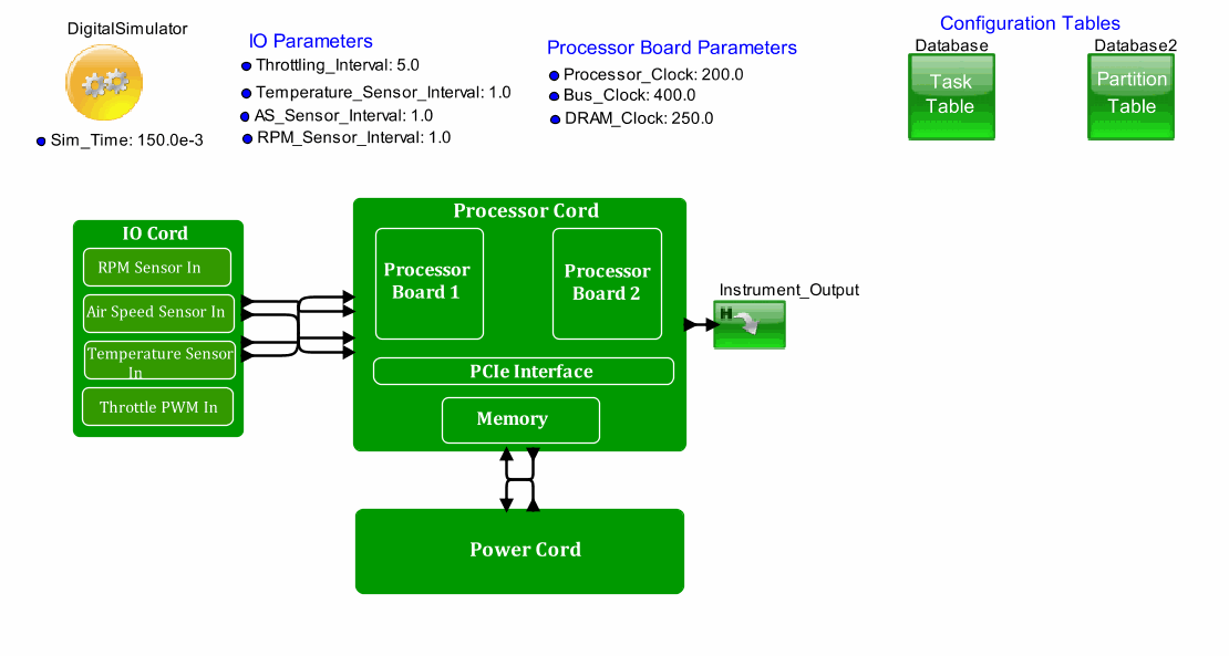 <h2>IO_Board</h2><table border="1"><tr><td><b>Parameter</b></td><td><b>Expression</b></td><td><b>Value</b></td></tr><tr><td>Block_Documentation</td><td>Enter User Documentation Here</td><td>Enter User Documentation Here</td></tr><tr><td>_hideName</td><td>true</td><td>true</td></tr><tr><td>RPM_Sensor_Interval</td><td>RPM_Sensor_Interval*1.0e-3</td><td>1.0E-3</td></tr><tr><td>AS_Sensor_Interval</td><td>AS_Sensor_Interval*1.0e-3</td><td>1.0E-3</td></tr><tr><td>Temperature_Sensor_Interval</td><td>Temperature_Sensor_Interval*1.0e-3</td><td>1.0E-3</td></tr><tr><td>Throttling_Interval</td><td>Throttling_Interval*1.0e-3</td><td>0.005</td></tr></table> <h2>Power_Cord_1</h2><table border="1"><tr><td><b>Parameter</b></td><td><b>Expression</b></td><td><b>Value</b></td></tr><tr><td>Block_Documentation</td><td>Enter User Documentation Here</td><td>Enter User Documentation Here</td></tr><tr><td>_hideName</td><td>true</td><td>true</td></tr></table> <h2>Instrument_Output</h2><table border="1"><tr><td><b>Parameter</b></td><td><b>Expression</b></td><td><b>Value</b></td></tr><tr><td>Block_Documentation</td><td>Enter User Documentation Here</td><td>Enter User Documentation Here</td></tr></table> <h2>Database2</h2><table border="1"><tr><td><b>Parameter</b></td><td><b>Expression</b></td><td><b>Value</b></td></tr><tr><td>Block_Documentation</td><td>*.xml, *.csv files abs or rel (./) path\\n  -- *.csv real columns set to number\\nInput_Fields == Lookup_Fields (num, type)\\nOutput_Expr: match, match_last, match_all\\n  -- match_all.field not allowed</td><td>*.xml, *.csv files abs or rel (./) path\\n  -- *.csv real columns set to number\\nInput_Fields == Lookup_Fields (num, type)\\nOutput_Expr: match, match_last, match_all\\n  -- match_all.field not allowed</td></tr><tr><td>Linking_Name</td><td>&quot;Partitioning&quot;</td><td>&quot;Partitioning&quot;</td></tr><tr><td>fileOrURL</td><td>&nbsp;</td><td>&quot;&quot;</td></tr><tr><td>Data_Structure_Text</td><td>Partition\tPeriod\t   ;\\n0               0.0       ;\\n1\t\t20.00e-3  ;\\n2\t\t35.00e-3  ;\\n3\t\t30.00e-3  ;\\n</td><td>Partition\tPeriod\t   ;\\n0               0.0       ;\\n1\t\t20.00e-3  ;\\n2\t\t35.00e-3  ;\\n3\t\t30.00e-3  ;\\n</td></tr><tr><td>Input_Fields</td><td>&quot;Partition&quot;</td><td>&quot;Partition&quot;</td></tr><tr><td>Lookup_Fields</td><td>&quot;Partition&quot;</td><td>&quot;Partition&quot;</td></tr><tr><td>Output_Expression</td><td>&quot;output = match&quot; /* FORMAT output = match.fieldb */</td><td>&quot;output = match&quot;</td></tr><tr><td>Mode</td><td>Read</td><td>Read</td></tr></table> <h2>Jet Engine Control Unit</h2><table border="1"><tr><td><b>Parameter</b></td><td><b>Expression</b></td><td><b>Value</b></td></tr><tr><td>Block_Documentation</td><td>Enter User Documentation Here</td><td>Enter User Documentation Here</td></tr><tr><td>_hideName</td><td>true</td><td>true</td></tr><tr><td>NumOfPartition</td><td>3</td><td>3</td></tr><tr><td>Processor_Board_Failure</td><td>Board_1</td><td>&quot;Board_1&quot;</td></tr></table> <h2>Database</h2><table border="1"><tr><td><b>Parameter</b></td><td><b>Expression</b></td><td><b>Value</b></td></tr><tr><td>Block_Documentation</td><td>Mac_ID    :: Mac_ID Address   Identifier :: &quot;FF:FF&quot; Broadcast  \\nSR_Class  :: QoS, A or B      Mbps       :: BW for Stream</td><td>Mac_ID    :: Mac_ID Address   Identifier :: &quot;FF:FF&quot; Broadcast  \\nSR_Class  :: QoS, A or B      Mbps       :: BW for Stream</td></tr><tr><td>Linking_Name</td><td>&quot;TaskList&quot;</td><td>&quot;TaskList&quot;</td></tr><tr><td>fileOrURL</td><td>&nbsp;</td><td>&quot;&quot;</td></tr><tr><td>Data_Structure_Text</td><td>ID Task_Partition  Task_Name    Destination\t\t  Frequency     Semaphores A_Variables Timers A_Priority ExecTime Deadline ;       \\n1 \t1\t     Engine1      PPC750_1       1.0e-4        4\t\t        12         2\t101   \t  0.3e-3   0.40e-5 ; \\n2 \t1\t     Engine2      PPC750_1       3.0e-4        6\t\t        12         2\t102   \t  0.3e-3   0.40e-5 ;\\n3 \t1\t     Engine3      PPC750_1       4.0e-4        8\t\t        12         2\t103   \t  0.3e-3   0.40e-5 ;\\n4 \t1\t     Engine4      PPC750_1      10.0e-4        2\t\t        12         2\t104       0.3e-3   0.40e-3 ;\\n5 \t1\t     Brake1       PPC750_2       1.0e-4        2             12   \t   4\t101    \t  0.3e-3   0.40e-3 ; \\n6 \t1\t     Brake2       PPC750_2       3.0e-4        4             12   \t   6\t102    \t  0.3e-3   0.40e-3 ;\\n7 \t1\t     Brake3       PPC750_2        4.0e-4        2             12   \t   8\t103    \t  0.3e-3   0.40e-3 ;\\n8 \t1\t     Brake4       PPC750_2       10.0e-4        2             12   \t   2\t104       0.3e-3  0.40e-3 ;\\n9 \t2\t     Body1        PPC750_2        1.0e-4        2             12   \t   4\t101       0.3e-3  0.40e-3 ; \\n10 \t2\t     Body2        PPC750_2        3.0e-4        4             12   \t   6\t102       0.3e-3  0.40e-3 ;\\n11 \t2\t     Body3        PPC750_2        4.0e-4        2             12   \t   8\t103       0.3e-3  0.40e-3 ;\\n12 \t2\t     Body4        PPC750_2       10.0e-4        2             12   \t   2\t104       0.3e-3  0.40e-3 ;\\n13 \t3\t     Safety1      PPC750_1        1.0e-4        2             12   \t   4\t101    \t  0.3e-3   0.40e-3 ; \\n14 \t3\t     Safety2      PPC750_1        3.0e-4        4             12   \t   6\t102    \t  0.3e-3   0.40e-3 ;\\n15 \t3\t     Safety3      PPC750_1        4.0e-4        2             12   \t   8\t103    \t  0.3e-3   0.40e-3 ;\\n16 \t3\t     Safety4      PPC750_1       10.0e-4        2             12   \t   2\t104    \t  0.3e-3   0.40e-3 ;\\n17 \t3\t     Accelerate   PPC750_1       10.0e-4        2             12   \t   2\t104    \t  0.3e-3   0.40e-3 ;\\n18 \t3\t     Decelerate   PPC750_1       10.0e-4        2             12   \t   2\t104    \t  0.3e-3   0.40e-3 ;</td><td>ID Task_Partition  Task_Name    Destination\t\t  Frequency     Semaphores A_Variables Timers A_Priority ExecTime Deadline ;       \\n1 \t1\t     Engine1      PPC