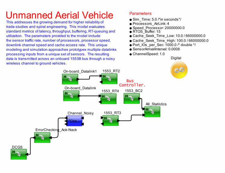 <h2>1553_BC2</h2><table border="1"><tr><td><b>Parameter</b></td><td><b>Expression</b></td><td><b>Value</b></td></tr><tr><td>Block_Documentation</td><td>Enter User Documentation Here</td><td>Enter User Documentation Here</td></tr><tr><td>Bus_Name</td><td>&quot;MyBusName&quot; /* String */</td><td>&quot;MyBusName&quot;</td></tr><tr><td>Main_Bus_Length</td><td>10.0 /* Feet */</td><td>10.0</td></tr><tr><td>Number_of_Remote_Terminals</td><td>3 /* Integer */</td><td>3</td></tr><tr><td>Sim_Time</td><td>Sim_Time</td><td>5.0</td></tr><tr><td>Internal_Constant</td><td>Main_Bus_Length / 2.0 /* Do Not Modify */</td><td>5.0</td></tr></table> <h2>1553_RT3</h2><table border="1"><tr><td><b>Parameter</b></td><td><b>Expression</b></td><td><b>Value</b></td></tr><tr><td>Block_Documentation</td><td>Enter User Documentation Here</td><td>Enter User Documentation Here</td></tr><tr><td>Bus_Name</td><td>&quot;MyBusName&quot; /* String */</td><td>&quot;MyBusName&quot;</td></tr><tr><td>Size_Field_Name</td><td>&quot;Frame_Size&quot; /* Integer */</td><td>&quot;Frame_Size&quot;</td></tr><tr><td>Destination_Field_Name</td><td>&quot;Final_Place&quot; /* Integer */</td><td>&quot;Final_Place&quot;</td></tr><tr><td>Distance_to_Main_Segment</td><td>10.0 /* Feet */</td><td>10.0</td></tr><tr><td>Port_Number</td><td>3 /* Integer */</td><td>3</td></tr></table> <h2>1553_RT4</h2><table border="1"><tr><td><b>Parameter</b></td><td><b>Expression</b></td><td><b>Value</b></td></tr><tr><td>Block_Documentation</td><td>Enter User Documentation Here</td><td>Enter User Documentation Here</td></tr><tr><td>Bus_Name</td><td>&quot;MyBusName&quot; /* String */</td><td>&quot;MyBusName&quot;</td></tr><tr><td>Size_Field_Name</td><td>&quot;Frame_Size&quot; /* Integer */</td><td>&quot;Frame_Size&quot;</td></tr><tr><td>Destination_Field_Name</td><td>&quot;Final_Place&quot; /* Integer */</td><td>&quot;Final_Place&quot;</td></tr><tr><td>Distance_to_Main_Segment</td><td>10.0 /* Feet */</td><td>10.0</td></tr><tr><td>Port_Number</td><td>2 /* Integer */</td><td>2</td></tr></table> <h2>1553_RT2</h2><table border="1"><tr><td><b>Parameter</b></td><td><b>Expression</b></td><td><b>Value</b></td></tr><tr><td>Block_Documentation</td><td>Enter User Documentation Here</td><td>Enter User Documentation Here</td></tr><tr><td>Bus_Name</td><td>&quot;MyBusName&quot; /* String */</td><td>&quot;MyBusName&quot;</td></tr><tr><td>Size_Field_Name</td><td>&quot;Frame_Size&quot; /* Integer */</td><td>&quot;Frame_Size&quot;</td></tr><tr><td>Destination_Field_Name</td><td>&quot;Final_Place&quot; /* Integer */</td><td>&quot;Final_Place&quot;</td></tr><tr><td>Distance_to_Main_Segment</td><td>10.0 /* Feet */</td><td>10.0</td></tr><tr><td>Port_Number</td><td>1 /* Integer */</td><td>1</td></tr></table> <h2>On-board_Datalink</h2><table border="1"><tr><td><b>Parameter</b></td><td><b>Expression</b></td><td><b>Value</b></td></tr><tr><td>Block_Documentation</td><td>Enter User Documentation Here</td><td>Enter User Documentation Here</td></tr><tr><td>_imagePath</td><td>F-16.gif</td><td>F-16.gif</td></tr><tr><td>ACS_Number</td><td>2</td><td>2</td></tr><tr><td>ACS_ID</td><td>&quot;Data_Link_2&quot;</td><td>&quot;Data_Link_2&quot;</td></tr><tr><td>ACS_Name</td><td>&quot;ACS2&quot;</td><td>&quot;ACS2&quot;</td></tr><tr><td>Sim_Time</td><td>Sim_Time</td><td>5.0</td></tr><tr><td>ACS_Sources</td><td>&quot;Broadcast, MASINTData_Link_1, InfraredData_Link_1, LASERData_Link_1, MaskedTSData_Link_1&quot;</td><td>&quot;Broadcast, MASINTData_Link_1, InfraredData_Link_1, LASERData_Link_1, MaskedTSData_Link_1&quot;</td></tr><tr><td>ACS_Source_Num</td><td>&quot;1, 2, 3, 4, 5&quot;</td><td>&quot;1, 2, 3, 4, 5&quot;</td></tr><tr><td>Buf_Plot_Name</td><td>&quot;Data_Link_2_Buf&quot;</td><td>&quot;Data_Link_2_Buf&quot;</td></tr><tr><td>Processor</td><td>Processors_AirLink</td><td>4</td></tr><tr><td>Speed_Processor</td><td>Speed_Processor</td><td>2.0E7</td></tr><tr><td>Sen_Start_TIme</td><td>0.002</td><td>0.002</td></tr><tr><td>Sen_Mean_Time</td><td>0.008</td><td>0.008</td></tr><tr><td>RTOS_Buffer</td><td>RTOS_Buffer</td><td>15</td></tr><tr><td>Cache_Seek_Time_High</td><td>Cache_Seek_Time_High</td><td>1.5151515151515E-6</td></tr><tr><td>Cache_Seek_Time_Low</td><td>Cache_Seek_Time_Low</td><td>1.5151515151515E-7</td></tr></table> <h2>On-board_Datalink1</h2><table border="1"><tr><td><b>Parameter</b></td><td><b>Expression</b></td><td><b>Value</b></td></tr><tr><td>Block_Documentation</td><td>Enter User Documentation Here</td><td>Enter User Documentation Here</td></tr><tr><td>_imagePath</td><td>F-16.gif</td><td>F-16.gif</td></tr><tr><td>ACS_Number</td><td>1</td><td>1</td></tr><tr><td>ACS_ID</td><td>&quot;Data_Link_1&quot;</td><td>&quot;Data_Link_1&quot;</td></tr><tr><td>ACS_Name</td><td>&quot;ACS1&quot;</td><td>&quot;ACS1&quot;</td></tr><tr><td>Sim_Time</td><td>Sim_Time</td><td>5.0</td></tr><tr><td>ACS_Sources</td><td>&quot;Broadcast, MASINTData_Link_1, InfraredData_Link_1, LASERData_Link_1, MaskedTSData_Link_1&quot;</td><td>&quot;Broadcast, MASINTData_Link_1, InfraredData_Link_1, LASERData_Link_1, MaskedTSData_Link_1&quot;</td></tr><tr><td>ACS_Source_Num</td><td>&quot;1, 2, 3, 4, 5&quot;</td><td>&quot;1, 2, 3, 4, 5&quot;</td></tr><tr><td>Buf_Plot_Name</td><td>&quot;Data_Link_1_Buf&quot;</td><td>&quot;Data_Link_1_Buf&quot;</td></tr><tr><td>Processor</td><td>Processors_AirLink</td><td>4</td></tr><tr><td>Speed_Processor</td><td>Speed_Processor</td><td>2.0E7</td></tr><tr><td>Sen_Start_TIme</td><td>0.005</td><td>0.005</td></tr><tr><td>Sen_Mean_Time</td><td>SensorArrivalInterval</td><td>8.0E-4</td></tr><tr><td>RTOS_Buffer</td><td>RTOS_Buffer</td><td>15</td></tr><tr><td>Cache_Seek_Time_High</td><td>Cache_Seek_Time_High</td><td>1.5151515151515E-6</td></tr><tr><td>Cache_Seek_Time_Low</td><td>Cache_Seek_Time_Low</td><td>1.5151515151515E-7</td></tr></table> <h2>All_Statistics</h2><table border="1"><tr><td><b>Parameter</b></td><td><b>Expression</b></td><td><b>Value</b></td></tr><tr><td>Block_Documentation</td><td>Enter User Docume